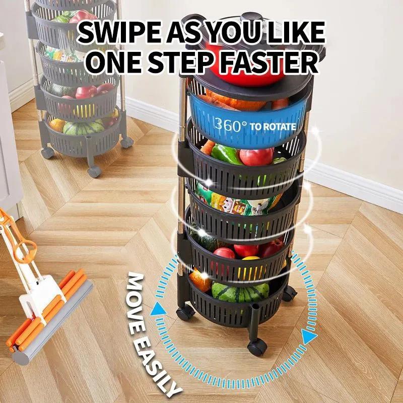 • 360-Degree 5 tier Rotating Moveable Multi-Tier Round plastic Baskets and steel Rods Vegetable & Fruit Organizer Rack for Kitchen Storage Baskets